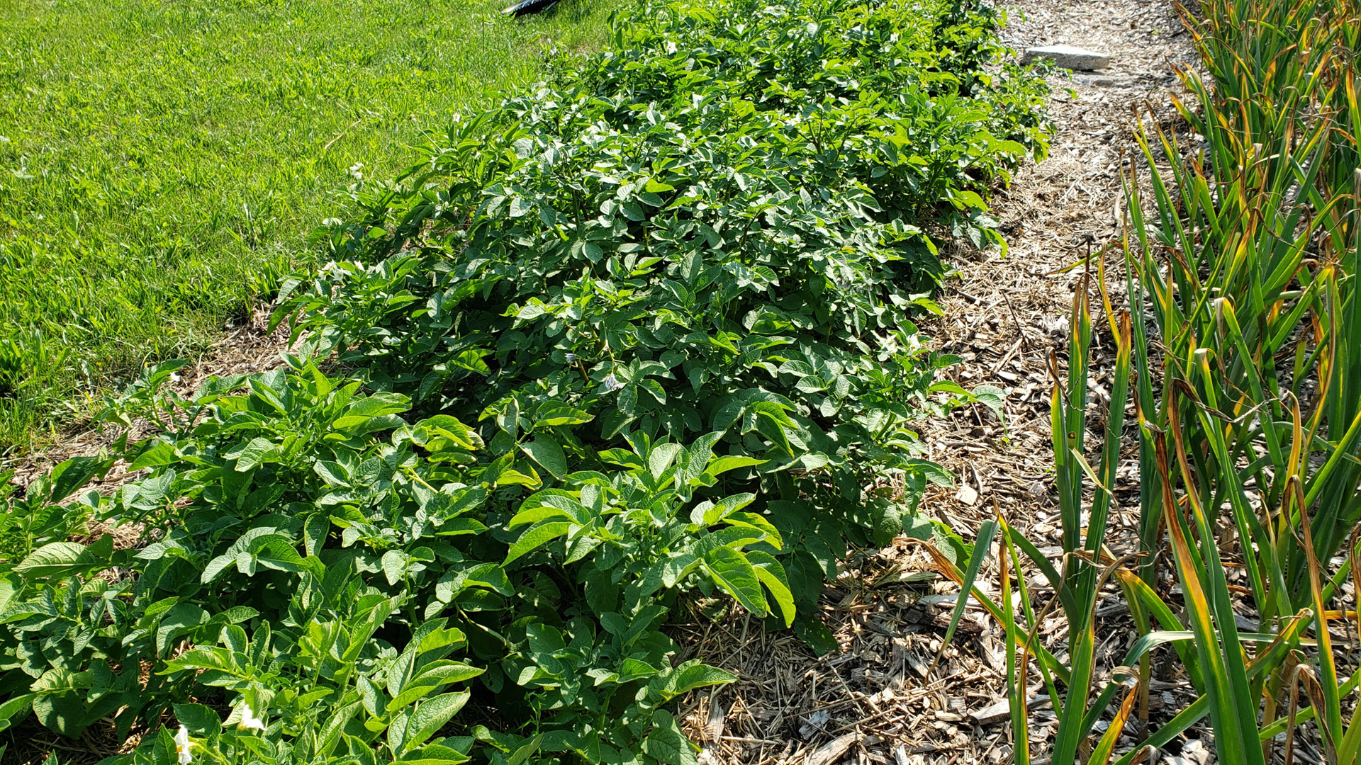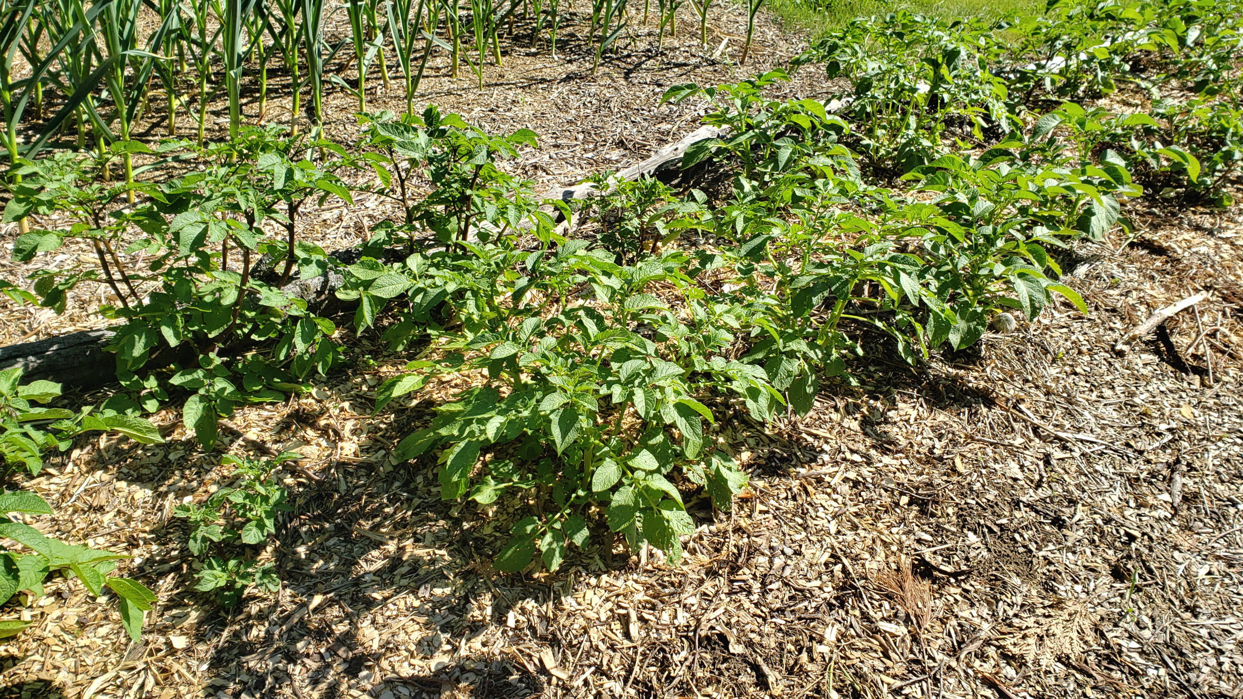 Potato plants are growing pretty good this year. I surrounded them with sheep manure. |