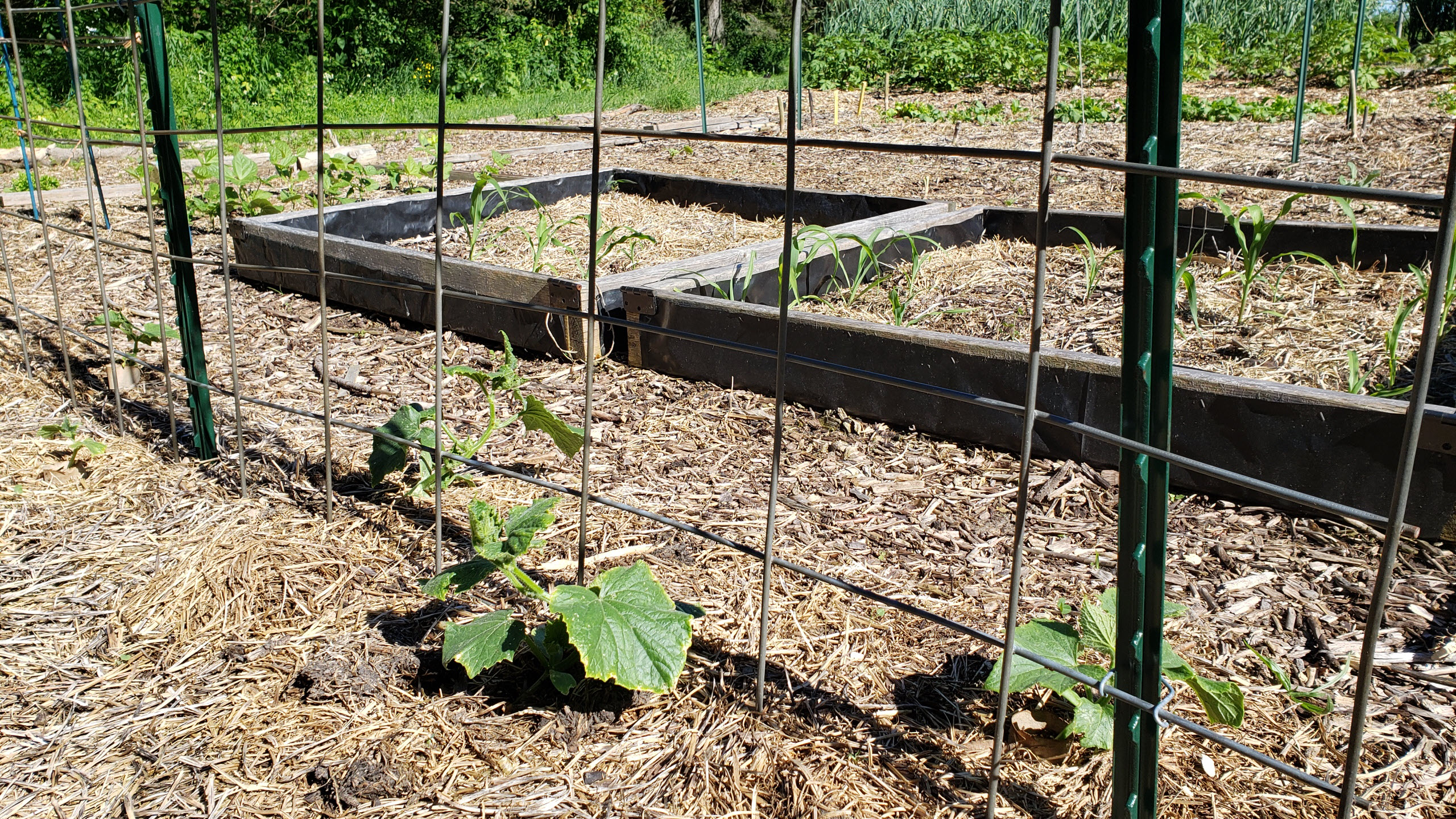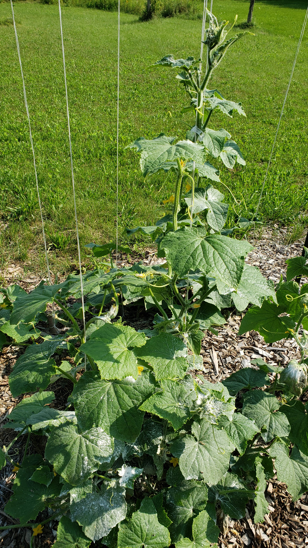 Cucumbers. Some of the plants are killed by wilt, which is a bacteria spread by cucumber beetles. I have been using Dr. Bronner’s soap mix to suppress them. |