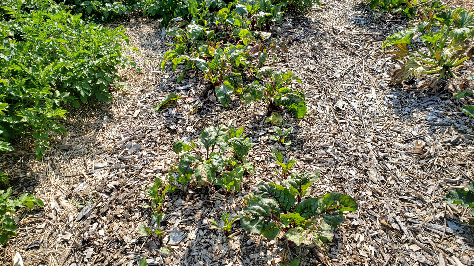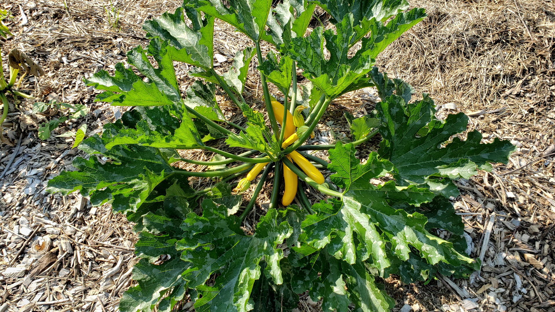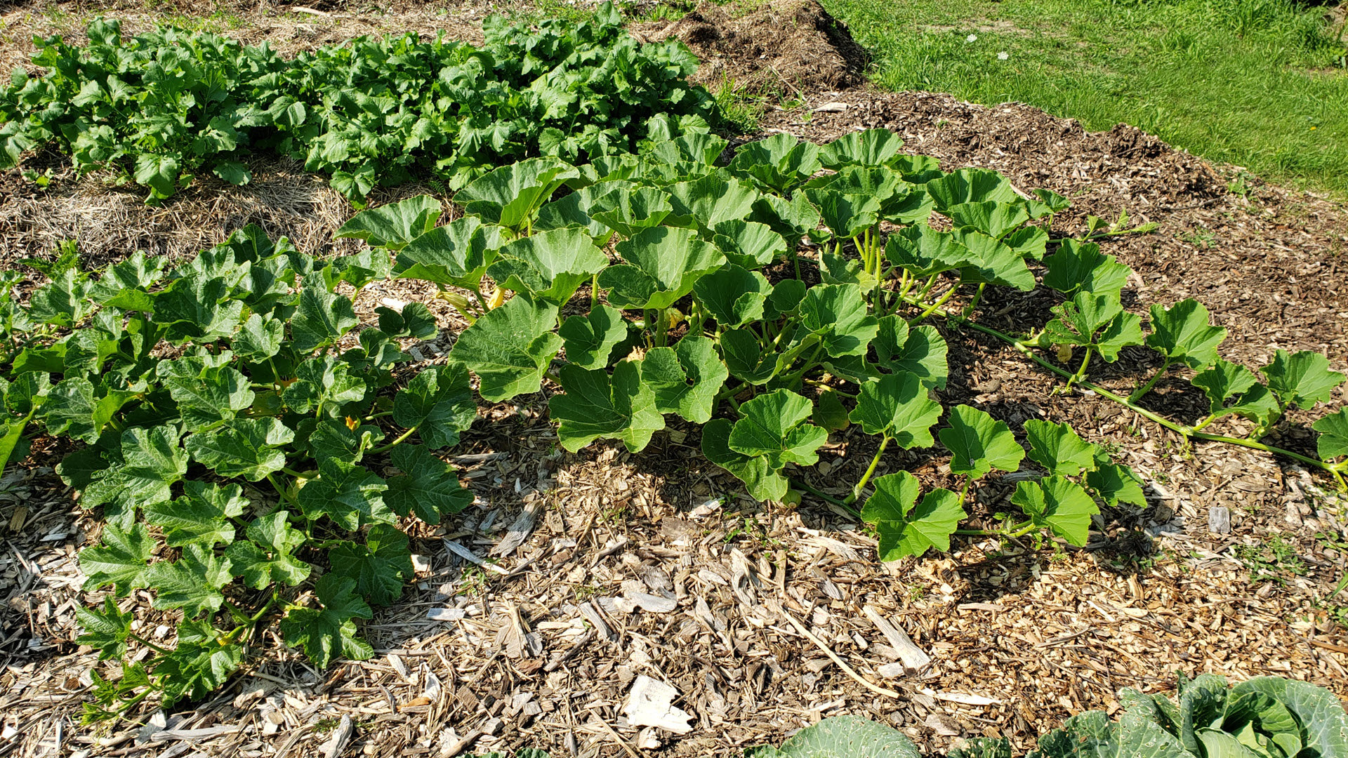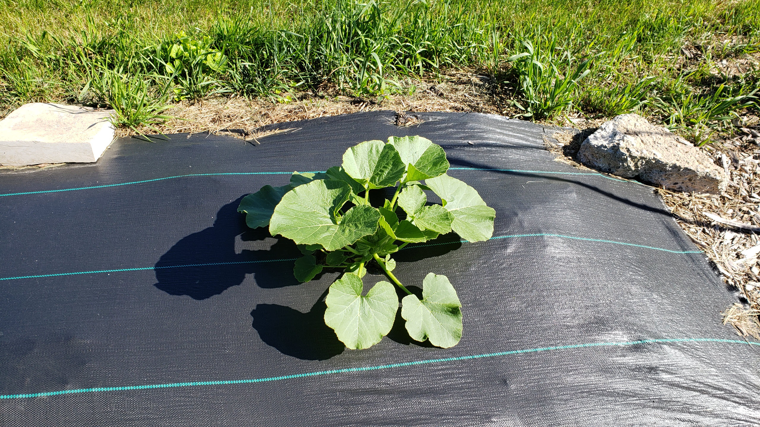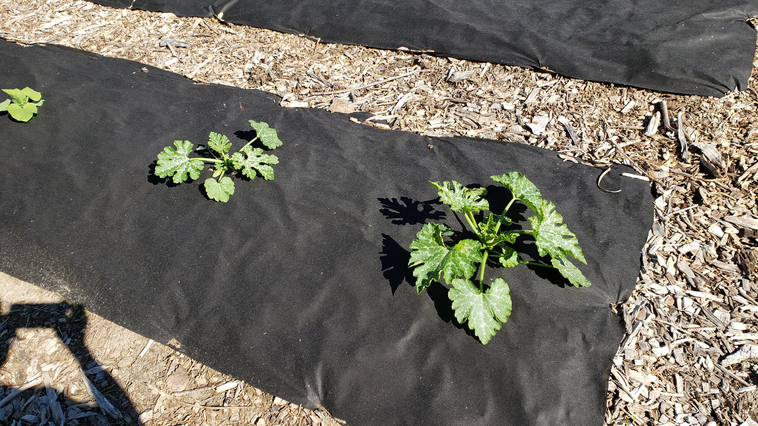 Zucchini with weed barrier beneath to suppress bindweeds. |