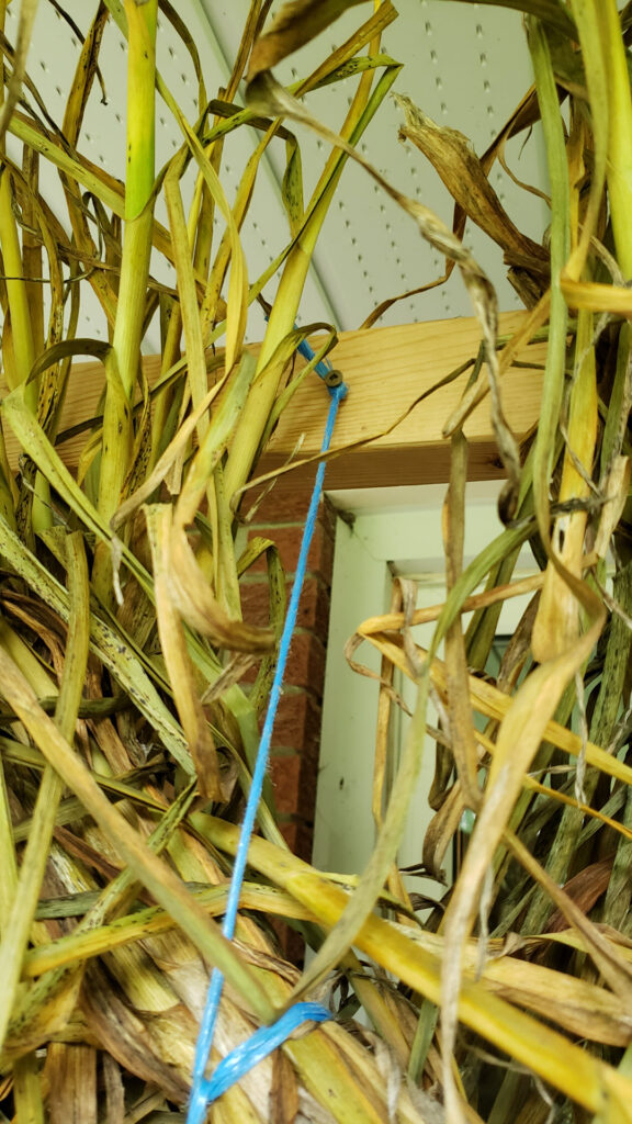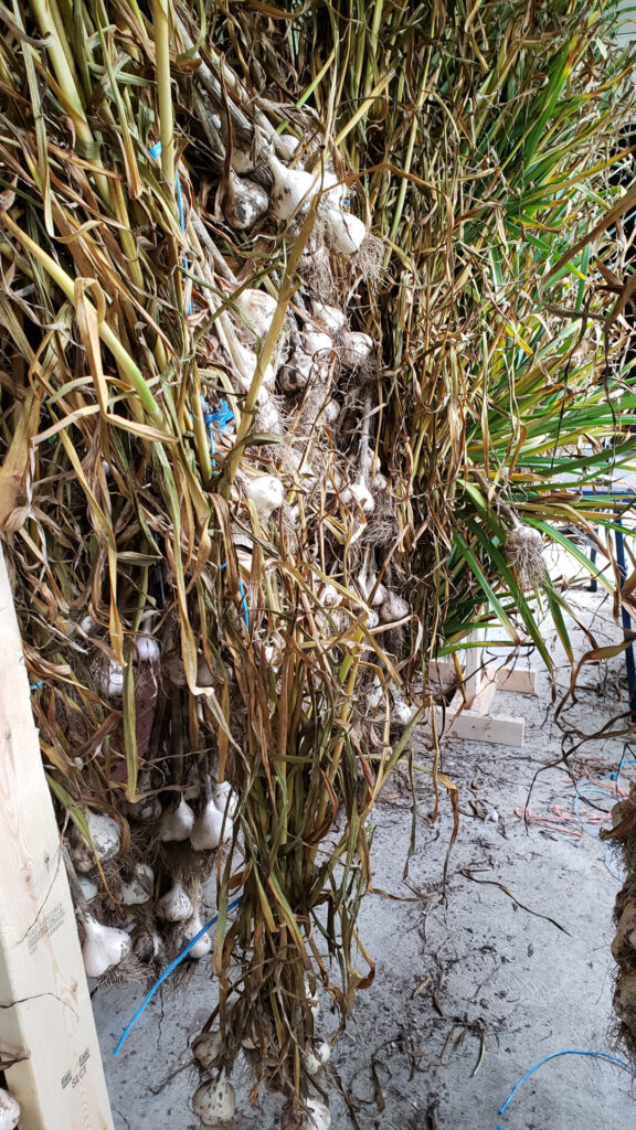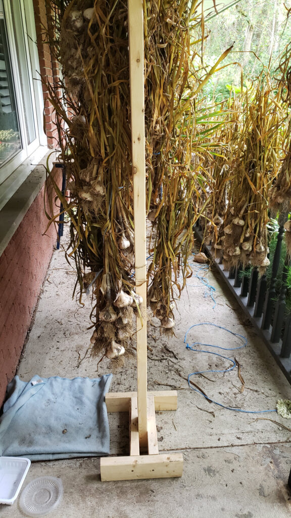 My stand of 8′ long top piece at a height of 7′ tall can hold about 600 garlic bulbs. |