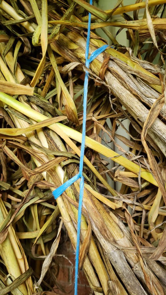 Each piece of bale twine can hold about 50 garlic bulbs, with 10 bulbs in a bundle for each counting. |