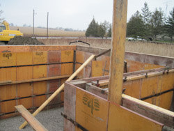 On a Saturday another crew of concrete workers came and form the foundation walls. They setup the wood boards and 2x4s so that the concrete will be poured in between the boards.
