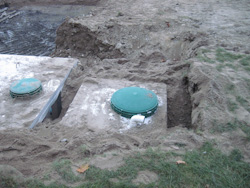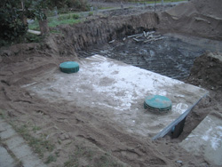Since the elevation of our front lawn does not meet requirement, we also need a pump chamber with a submersible pump installed. Any grey water from the septic tank would flow into this chamber and pump out to the tile bed. |