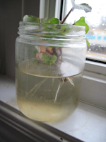 Now a couple of weeks have passed and the slip is tall enough for me to snap it. I put the slips into a separate container and wait patiently again for the roots to grow. When the weather is warm enough, I will plant the slips directly into the garden. One thing I learn from a book is that it would be very helpful if we place a clear plastic film tight on the soil where the sweet potato is going. This would warm up the soil much quicker since we only have a short growing season here in Canada.