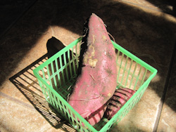 After 2 years of failing, we are able to grow sweet potatoes in our garden. I grew the slip directly from a store bought sweet potato (read here and here) and used 6 mil clear plastic film to cover the soil for the entire season. Although most of the tubers are small, I count it as a success because the bed has only 5 inches of soil and the slips were close. Sweet potatoes are nutritious and hard to grow in warm climate countries. They do not need fur tile soil and can withstand drought. It is a wonderful gift from God, same with everything else.
