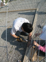 We have adopted the plan from Mike Hansen, using cattle panels and hog panels. The pen is about 8.5 x 12 feet in size. First, we build the base using 2x4s, cutting triangle plywood pieces as corner support. Then we bend the cattle panel so that it forms a hoop style. The hog panels are then attached to the cattle panels with wire ties. All the panels are attached to the base frame with fence staples. We also attach chicken wires around the panels. In order for the chickens to go in and out the coop, we cut a small section on one side of the hog panel. The cattle panel is sturdy and we can hang the feeder no problem. The coop is finished with 2 lawn mower tires attached at the back and a pull handle at the front. It is covered with tarp to provide shelter from sun and rain.