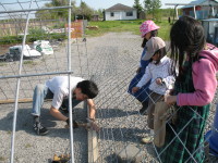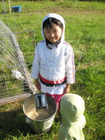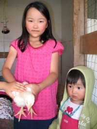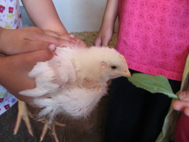 The children are thrilled to see so many baby chicks and can’t wait to hold them. After the fun, we put them into the permanent chicken coop where the brood guard, water, feeder and heat lamp are waiting. Exciting!