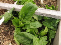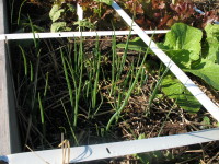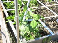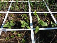 In the center squares, the larger plants are sunflower and the smaller are romaine lettuce. This way the sunflower can provide some shade to the lettuce so they won’t bolt too early.