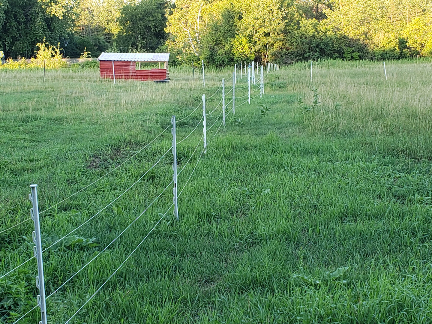 Electric wire and step-in posts. Looking from above, the electric fences would form a “+” shape. We place the mobile sheep shed close to the intersection of the “+”. |