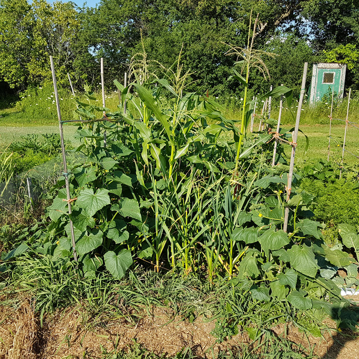 Corn, garlic and cucumber cramp into a small space but growing well in chicken compost. |