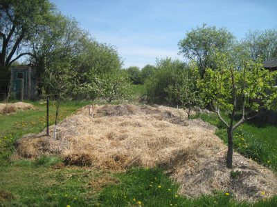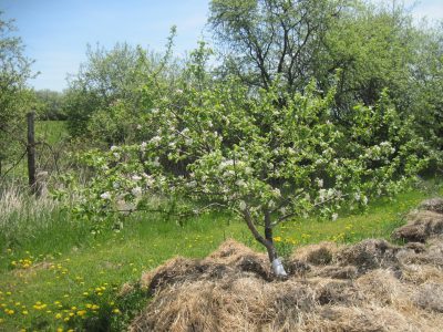 Since we have sheep, I have been piling the sheep manure in between the trees to cover the grass and weeds. I am sure the trees would benefit from the sheep manure compost and guess what, 5 of the trees are flowering this spring. In addition, I am attempting to apply some good orchard management practice: